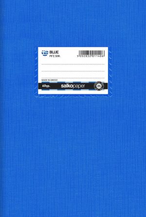 Το κλασσικό μαθητικό μπλε τετράδιο με ετικέτα σε θήκη.